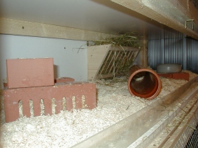 Damit es abwechslungsreich gestaltet ist, befinden sich mehrere Versteck- und Klettermöglichkeiten aus Steinbauten und große Plastikrohre zum Durchlaufen oder Ausruhen in der Etage. Für die Paare habe ich die Etagen in der Mitte geteilt, sodaß sie 2m x 0,60m zur Verfügung haben (s. Bild). Die Einrichtung ist natürlich ebenso abwechslungsreich.